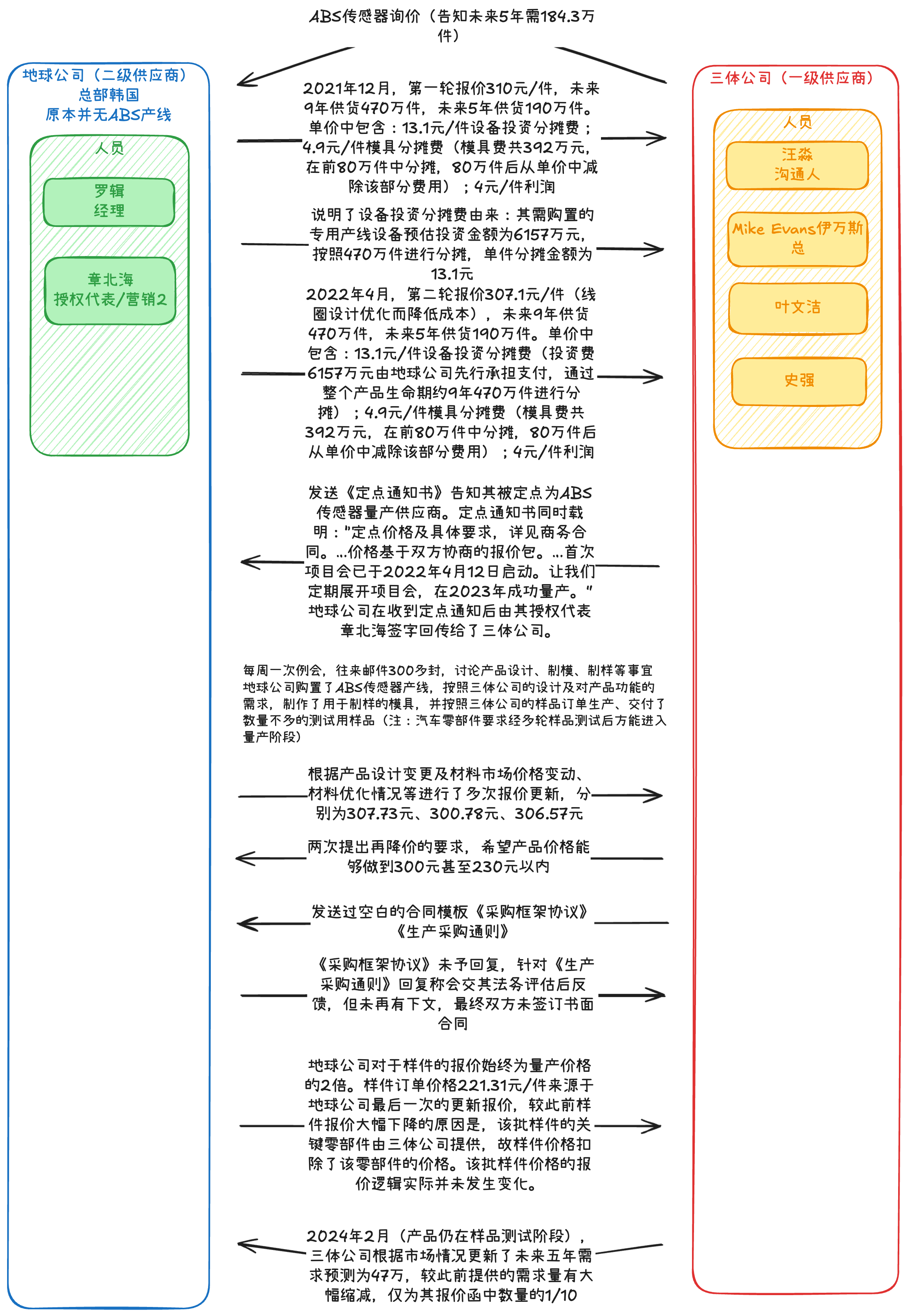 1 | 2021年下半年 | 三体公司为降本增效,有意寻找新的ABS传感器供应商协同优化现有产品设计并启动询价,询价时告知了未来五年的需求量为184.3万。 |